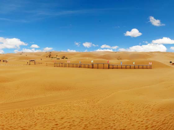 观赏集大漠、绿洲、黄河、高山于一体的世界垄断性旅游资源,体验在中国最大的天然滑沙场里悠然滑沙的感觉和 40秒飞越黄河的惊险刺激,感受具有浓郁蒙古族风味的风情接待及音乐篝火晚会,腾格里沙漠是中国第四大沙漠,沙漠与黄河相依相偎,在浩瀚的沙海中有许多的绿洲和村落,骆驼骆漫游在腾格里沙漠,不仅气象万千更别有情趣,在叮咚做响的驼铃声中感受着“丝绸之路”。